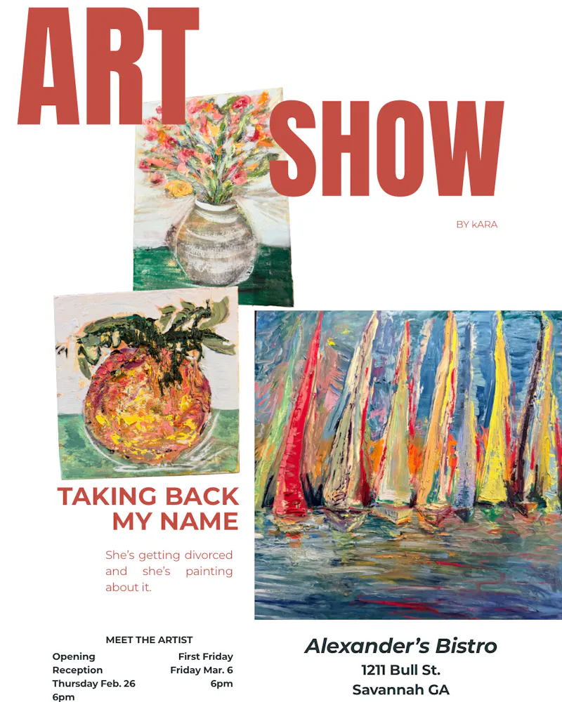 The Savannah art scene is large and dynamic. Alexander’s Bistro is proud to contribute by providing a venue for showing the work of local visual and performing artists. The artwork shown at the Bistro is diverse and exhibits change several times a year. All of the artwork is for sale with a portion of each sale going to different local charities.